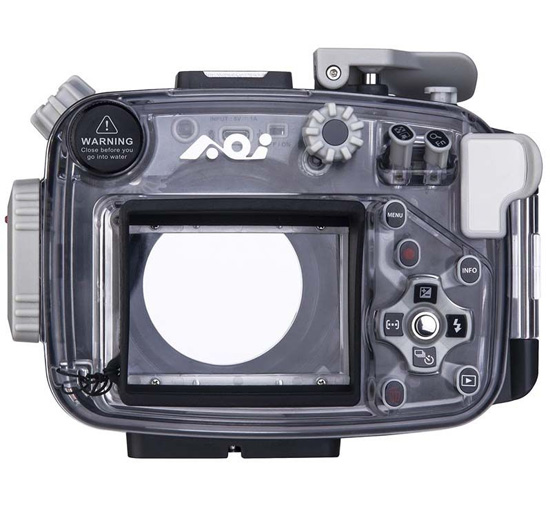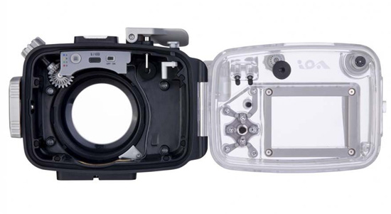 sterowanieNa zewnątrz obudowy znajdują sie liczne przyciski i pokrętła, które w sposób mechaniczny zapewniają dostęp do funkcji aparatu. Wszystkie są wyraźnie opisane, co ułatwia poruszanie się po dedykowanych nastawach. Dzięki zastosowaniu wewnętrznych profili producentowi udało się rozsunąć pewne guziki w stosunku do ich położenia na korpusie aparatu, co zwiększyło wygodę obsługi w czasie nurkowania. Widoczny poprzez przeźroczystą, tylną ściankę ekran pozwala na bezproblemowe kadrowanie. Zdejmowalna osłona przeciwsłoneczna zwiększa wygodę kadrowania przy mocnym bocznym świetle.